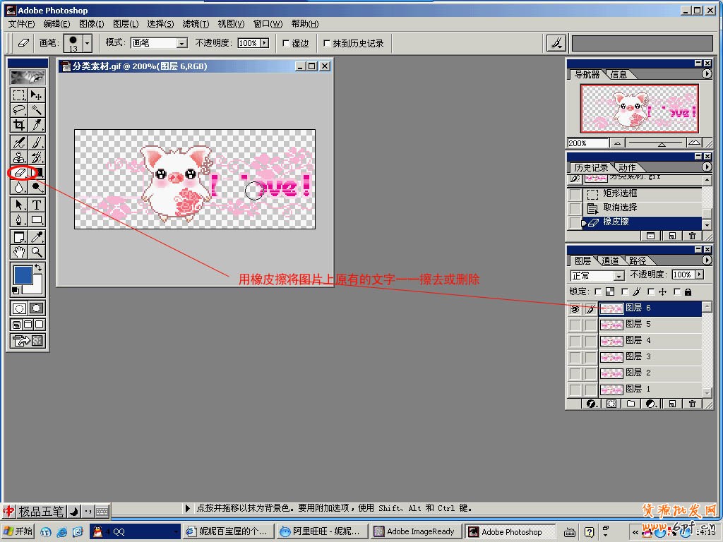 3.轉(zhuǎn)入到Adobe photoshop后,我們分別將文件的每一層上原有的文字刪除或用橡皮擦將它去掉,具體辦法如圖: