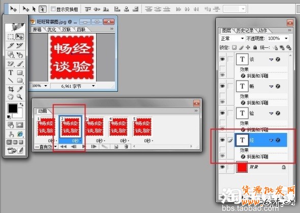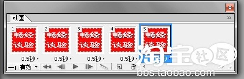 同樣道理,選擇第三幀,啟用“經(jīng)”“驗”這兩個文字圖層的“斜面和浮雕”效果;選擇第四幀,啟用“經(jīng)”“驗”“暢”這三個文字圖層的“斜面和浮雕”效果;選擇第五幀,啟用所用文字圖層的“斜面和浮雕”效果。經(jīng)過這樣處理之后,就得到了五個不同的畫面,第一個畫面是平面效果,第二畫面是突出一個字,第三個畫面是突出二個字…