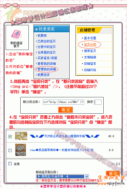 3.進入“管理店鋪”>“寶貝分類”,在“新的寶貝分類”中輸入代碼:<img src="圖片地址"/>。