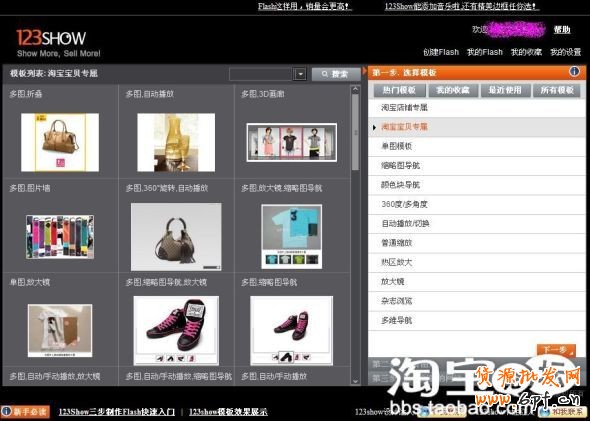 大家可以看到,左側(cè)的那一欄就是所有的Flash模版,其中包含各種形式的Flash展示——360度自動旋轉(zhuǎn)、放大鏡等等,這些會讓你的商品全方位的展現(xiàn)在買家眼前,從而促成訂單的成交。如何制作呢?第一步,選擇模版,親愛的們別挑花了眼喲,下圖為例
