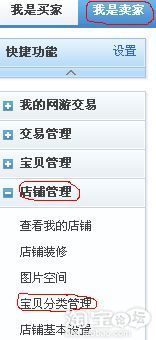 首先點擊我是賣家→店鋪管理→寶貝分類管理,
