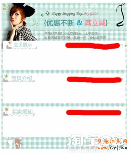 今天寫的這篇帖子是教大家怎么做描述模板的,個(gè)人覺得一個(gè)簡單實(shí)用的描述模板會(huì)比首頁更重要,因?yàn)槊慨?dāng)顧客搜索的寶貝的時(shí)候,點(diǎn)擊之后看到的是寶貝頁面而不是首頁,所以我們應(yīng)該重視寶貝描述的裝修和宣傳,這樣才可以為我們帶來更多的顧客哦!話不多說,先上教程的例子,紅線部分為抹掉的網(wǎng)址,要避免廣告嫌疑嘛??!