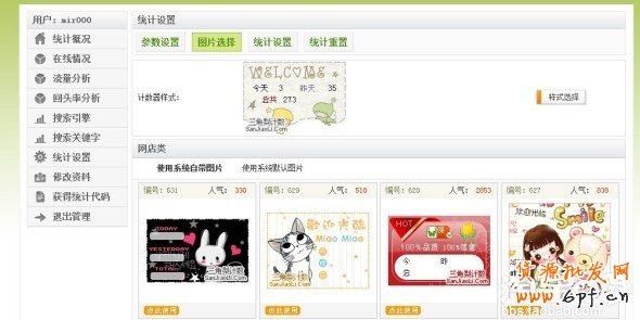 如果大家感覺不滿意計數器圖片背景,我們可以更換的!打開三角梨計數器網頁——登陸賬戶密碼——點擊統(tǒng)計設置——圖片選擇——點此使用就可以了。。。如下: