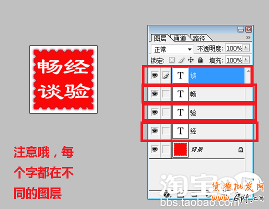 依次輸入自己想要輸入的文字,比如“經(jīng)驗暢談”,為了排列的方便,最好每個字單獨處于一個圖層。
