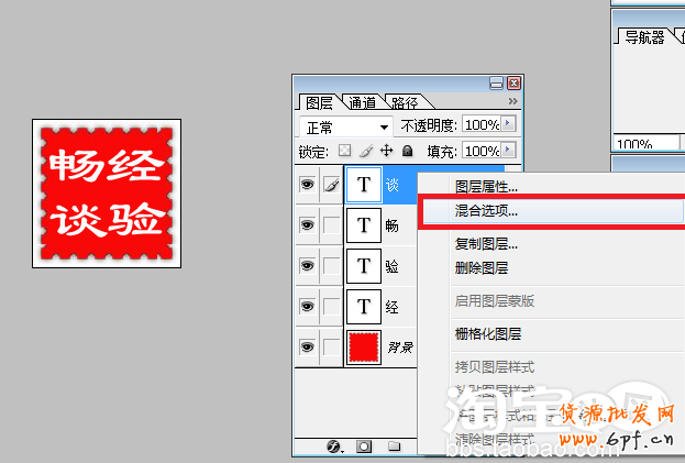 第八步:用鼠標在圖層面板中點擊“談”所在圖層,此時在這個圖層左側有一個毛筆,表明此圖層是當前圖層。在該圖層上,單擊鼠標右鍵,彈出如圖所示菜單