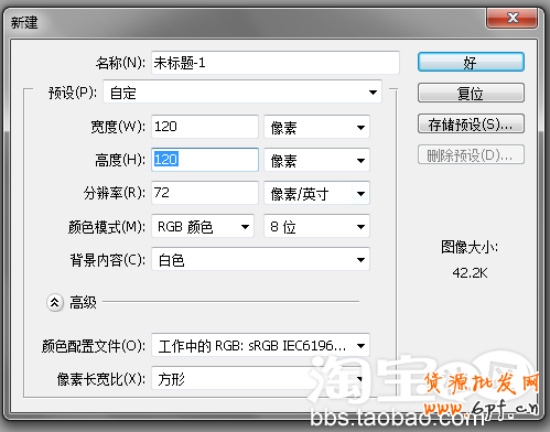 安裝好這兩個軟件之后,我們就可以動手進行制作了。第一步,啟動PS,點擊“文件”菜單項,選擇“新建”,在彈出對話框中,設置圖像的長度和寬度,由于旺旺頭像的本身限制,這里長寬最大只能是120像素哦。如圖所示: