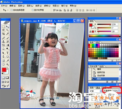 第三步:使用原貼中“第九步”的方法,將寶貝圖片中的“水印”圖層移動到寶貝圖片的合適位置,下面再在“圖層工具欄”中修改一下“水印”圖層的“不透明度”(如下圖中的紅圈所示)。設(shè)置“不透明度”就是將“水印”顯示的稍談一些,不能讓“水印”掩蓋了你的寶貝的光彩是吧!