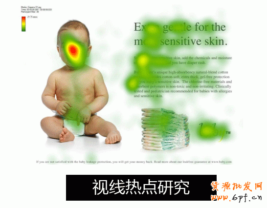 通過(guò)記錄統(tǒng)計(jì)發(fā)現(xiàn),很遺憾,人們的目光都聚焦在了嬰兒的臉上(紅色位置為重點(diǎn)瀏覽位置)!對(duì)他們的產(chǎn)品賣(mài)點(diǎn)的關(guān)注可以忽略不計(jì)!可以說(shuō)是個(gè)失敗的廣告。那么我的問(wèn)題來(lái)了!如果讓你做一個(gè)簡(jiǎn)單的修改,讓人們的目光轉(zhuǎn)移到文字標(biāo)題上,你會(huì)怎么做?(思考時(shí)間,先別看答案哦!)