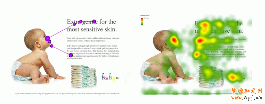 這是一張嬰兒紙尿褲的平面廣告初稿,并不是很有創(chuàng)意,因?yàn)樗a(chǎn)品的賣(mài)點(diǎn)是用文字說(shuō)明的(大標(biāo)題)。初稿完成后老外們找了很多的人來(lái)看,記錄下他們?yōu)g覽不同位置的先后順序和重點(diǎn)查看的位置,來(lái)進(jìn)行視線軌跡研究,發(fā)現(xiàn)人們往往把他們的賣(mài)點(diǎn)(大標(biāo)題)放在最后瀏覽。那么這些人是否對(duì)大標(biāo)題產(chǎn)生深刻的印象了呢?于是他們又做了另外一個(gè)實(shí)驗(yàn):
