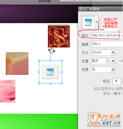 那我們現(xiàn)在就可以把這些之前放在淘寶空間相冊(cè)的圖片的鏈接復(fù)制在上圖的圖文廣告里面,然后自行調(diào)整圖片的大小。