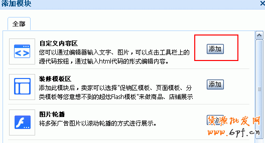 第二步B:點擊 “添加模塊” 后,出現(xiàn) “添加模塊”對話框,此時在 “自定義內(nèi)容區(qū)” 一欄選擇 “添加”。