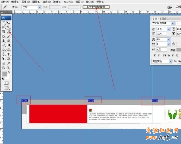 看上圖,在工具欄內(nèi)選擇切片工具,然后點(diǎn)擊窗口上面有個(gè)“基于參考線(xiàn)切片”,這個(gè)時(shí)候圖片上可以看到藍(lán)色的01,02,03的字樣,這個(gè)時(shí)候圖片切片好了,接下來(lái)是保存: