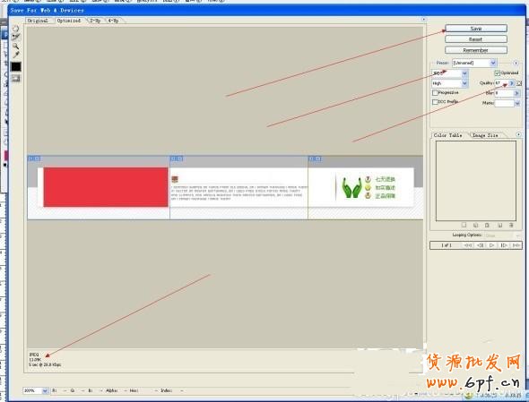 我這個(gè)是英文格式的 ,右上角第二個(gè)箭頭是現(xiàn)在圖片要保存的格式,一般是現(xiàn)在JPG,需要圖片背景格式的時(shí)候選PNG,我們這里選擇JPG,然后我們看左下角箭頭指向一個(gè)數(shù)字,這個(gè)就是圖片的容量,就是這個(gè)數(shù)值不能超過(guò)30K,如果有超30K,那么我們?cè)僬{(diào)整右上角有個(gè)指向數(shù)值的箭頭,這個(gè)是調(diào)節(jié)圖片的品質(zhì),和圖片的容量大小成正比,我們向下調(diào)就好,最好是然容量數(shù)值最接近30K,這樣既滿(mǎn)足小于30K,有在這個(gè)范圍內(nèi)最清晰!