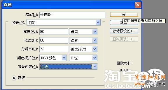 1、打開(kāi)Photoshop 文件—新建一個(gè)圖層(按照下圖設(shè)置好)因?yàn)榈赇侇^像要求尺寸要80*80的,所以我們必須要這樣設(shè)置。