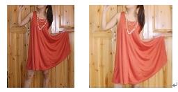 通過對(duì)其他店鋪的學(xué)習(xí),買來了適合的背景布,將衣服重新擺放塑形,并搭配了項(xiàng)鏈、花朵。同樣的一件衣服,是否演義出了不同的感覺。