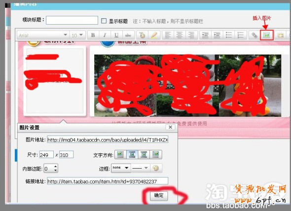 接下來給模板內(nèi) 添加自己的寶貝圖片 點(diǎn)擊 插入圖片 輸入 圖片地址 鏈接地址 點(diǎn)擊確定