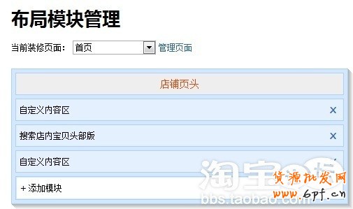 ③ 點(diǎn)擊添加,之后將你剛剛添加的自定義內(nèi)容區(qū)移動(dòng)到最頂端,使其變成圖六的布局樣式,弄完后就可以點(diǎn)擊頁(yè)面下面的保存按鈕了,之后就會(huì)自動(dòng)跳轉(zhuǎn)至首頁(yè)裝修界面了