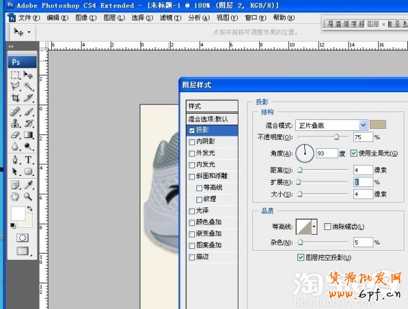 4.選中鞋子的圖層,添加圖層樣式-投影,以上教程講過,不再多說,參數(shù)見圖片。
