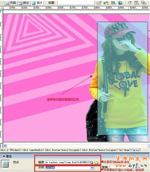 點(diǎn)擊矩形熱點(diǎn)工具,在上面的圖片里選擇要制作鏈接的區(qū)域,然后圖片下方的鏈接框里輸入鏈接地址,目標(biāo)欄里選擇_blank(注意:如果是新頁(yè)面打開(kāi)鏈接就選擇,不是的話就不做選擇)
