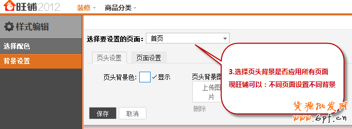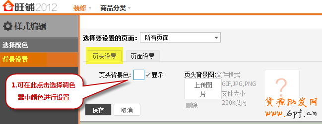 2、點(diǎn)擊”背景設(shè)置“ --”頁(yè)頭設(shè)置“進(jìn)店招位置的背景設(shè)置