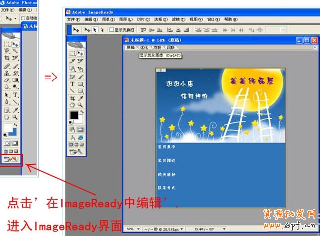 第一,雖然photoshop也有切片工具,但往往要切割得很準(zhǔn)確圖片才不裂開,如使用ImageReady來切片就不會有這樣的困擾了。在模版圖片打開的狀態(tài)下,切換ImageReady進(jìn)行切片處理;