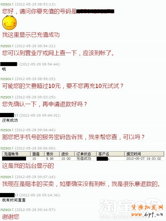 這一單購(gòu)買的寶貝是全國(guó)聯(lián)通10元話費(fèi),當(dāng)時(shí)我發(fā)現(xiàn)這一單后先和他打了招呼,告訴他付款后話費(fèi)就可以到帳了,他就付款了??墒沁^了一會(huì)兒,他和我聯(lián)系說(shuō)話費(fèi)還沒有到帳,我就連忙查詢我的后臺(tái),后臺(tái)顯示已經(jīng)充值成功。他說(shuō)他要充的手機(jī)已經(jīng)停機(jī)了。我說(shuō)您可以多等一會(huì)兒,已經(jīng)停機(jī)的手機(jī)到帳可能是慢一點(diǎn)兒,他說(shuō)好。過一會(huì)兒,他的旺旺就不在線了。我以為可能到帳了。