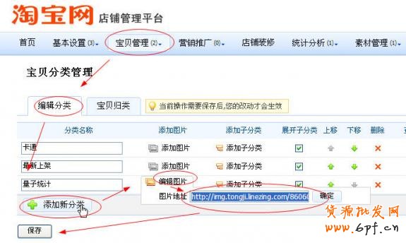 獲取了統(tǒng)計(jì)代碼后,請(qǐng)您登錄到店鋪管理平臺(tái),在“寶貝管理->寶貝分類管理”下面新建一個(gè)分類, 并為它添加圖片,在圖片的鏈接中粘貼入您在量子網(wǎng)站獲取的統(tǒng)計(jì)代碼,然后保存您的操作即可.具體操作界面如下圖: