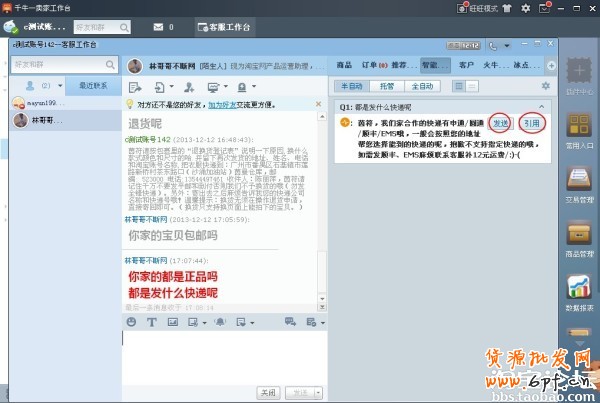 第三步:點(diǎn)擊到智能機(jī)器人的頁面,可以看到機(jī)器人自動識別買家的問題。對于推薦的回復(fù),需要修改的,點(diǎn)擊“引用”可在輸入框直接修改(或右鍵單擊推薦回復(fù)框修改);對于不需要修改回復(fù)的,直接點(diǎn)擊“發(fā)送”即可完成回復(fù)。