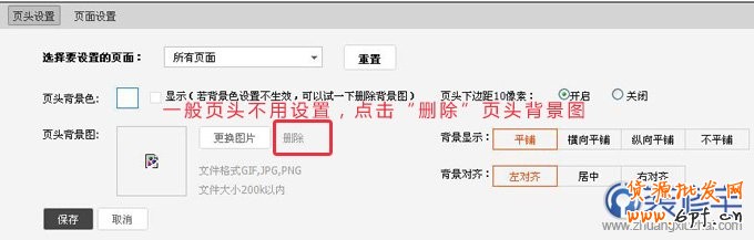 3、背景設(shè)置--頁頭設(shè)置:一般情況下,我們都會將頁頭背景與頁面背景保持一直,這樣整體裝修看起來會美觀一些,所以這里這樣刪除背景圖即可。