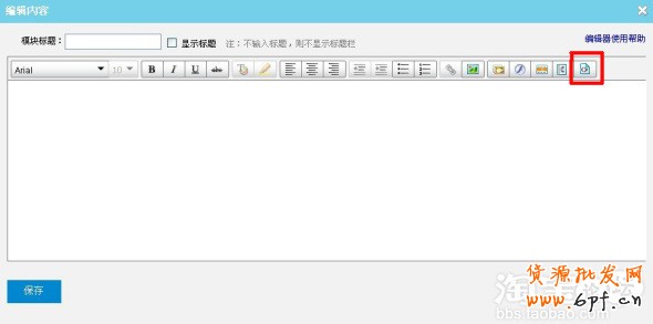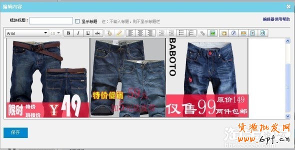然后先保存,之后再次打開(kāi)裝修寶貝詳情頁(yè),編輯之前保存好的自定義模塊,在點(diǎn)開(kāi)編輯窗口的右邊,有一個(gè)“編輯HTML源碼”命令按鈕,點(diǎn)擊,然后把之前保存在TXT文檔中的代碼復(fù)制進(jìn)去,
