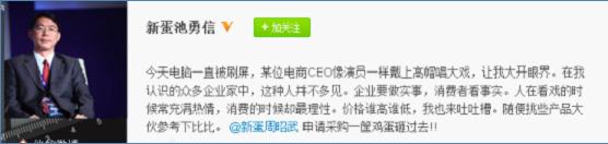 京東蘇寧價格戰(zhàn)開始第一天下午,中國新蛋網(wǎng)COO池勇信忍不住在微博上吐槽稱“某位電商CEO像演員一樣戴上高帽唱大戲,讓我大開眼界”,并列出了若干產(chǎn)品價格對比,聲稱參與價格戰(zhàn)的電商產(chǎn)品反而比新蛋網(wǎng)更貴。有網(wǎng)友評論稱此舉是暗諷京東蘇寧,也有網(wǎng)友稱這是新蛋在“搭車做廣告”“跟風(fēng)炒作”。