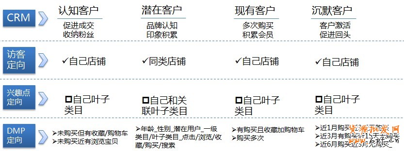 重點(diǎn)預(yù)熱前期,即11.1~11.5,DMP定向潛在、沉默客戶為主投放。興趣點(diǎn)定向中的關(guān)聯(lián)葉子類目和訪客定向的自定義同類店鋪需要在前期重點(diǎn)引入,比如女裝客戶除了女裝對(duì)應(yīng)的興趣點(diǎn)外,還可以增加女士內(nèi)衣和女鞋相關(guān)的興趣點(diǎn)。對(duì)于易復(fù)購/日常消費(fèi)品類目,預(yù)算比較大的話,群體和通投可適當(dāng)引入。