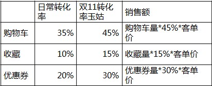 去年2013年收藏+購物車+優(yōu)惠券占到雙11總成交的42%,根據(jù)2014年日常成交、年中大促或8.28數(shù)據(jù),分解購物車、收藏和優(yōu)惠券需帶來的銷售額,并計(jì)算出所需的購物車、收藏量和優(yōu)惠券量,再分配到重點(diǎn)預(yù)熱期中的每一天。