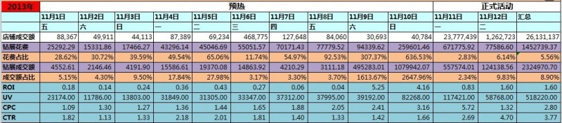 上圖案例是一位女裝掌柜2013年鉆展數(shù)據(jù)總結(jié)。鉆展消耗從11.1開始增加,到11.9加大消耗,雙11當(dāng)天達(dá)到最大;點(diǎn)擊成本(CPC)從11.1開始上升,11.8上漲到原來的2倍,到11.10上漲到原來的3倍,雙11當(dāng)天是11.1的5倍;ROI(3天點(diǎn)擊回報(bào)率)11.9~11.10這兩天點(diǎn)擊回報(bào)率很高,因?yàn)榛貓?bào)率上加入了雙11當(dāng)天的成交數(shù)據(jù),而雙11當(dāng)天由于點(diǎn)擊成本升高相應(yīng)的uv獲取少,最終回報(bào)率不高。從中可以看出,重點(diǎn)預(yù)熱的重要性不言而喻。這位女裝掌柜表示,今年重點(diǎn)預(yù)熱會(huì)提前,消耗會(huì)提前加大,就是考慮到重點(diǎn)預(yù)熱對(duì)銷售額的關(guān)鍵作用。