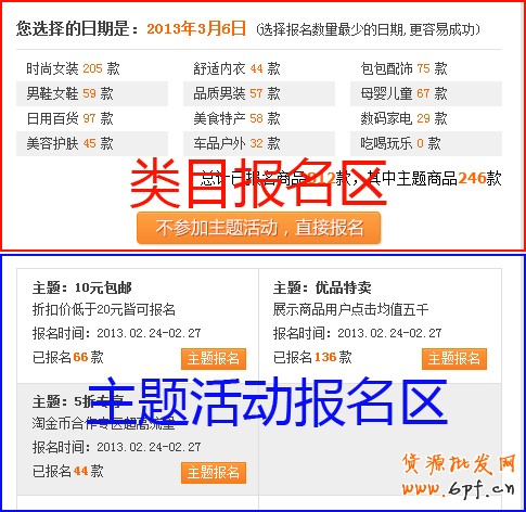 報(bào)名頁面上面為類目報(bào)名區(qū),下面為主題活動(dòng)報(bào)名區(qū),這是有分別的,會(huì)出現(xiàn)在不同的頁面。