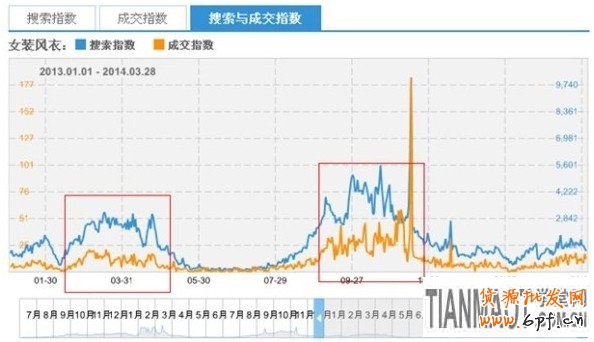 按上述圖示數(shù)據(jù)來看,女裝風衣一般集中在春季和秋季。其中春季的周期較短,秋季是風衣的高峰期,冬季人們需求量減少,夏季更是沒有需求了。針對這樣的情況,在春季風衣淘寶推廣上就要做到快、狠、準。