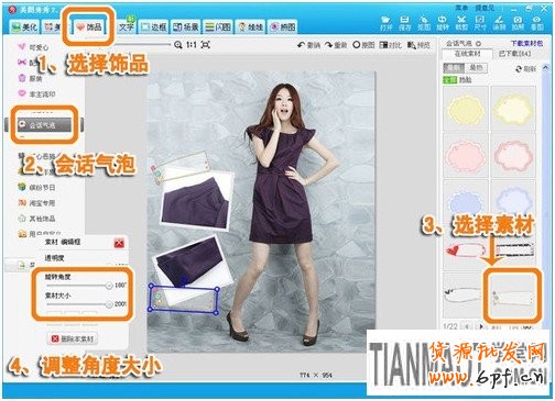 第三步:選擇"飾品/會話氣泡"或者是閃圖都可以,主要是看您自己的需要。然后添加漂亮素材。在藍色編輯框內(nèi),可以調(diào)整素材的角度、大小。
