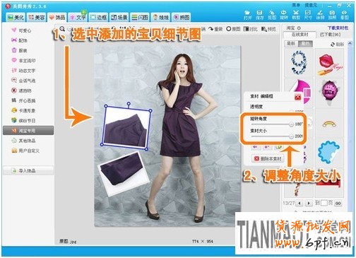 第二步:對添加進來的細節(jié)圖,需要根據(jù)自己的實際情況,適當調(diào)整大小、角度和位置,甚至透明度。只要選中需要編輯的寶貝,就可以自由設(shè)計了。
