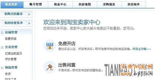 首先登錄阿里旺旺,進入淘寶網(wǎng),點擊“賣家中心”,然后在打開的窗口中點擊“免費開店”,如下圖所示: