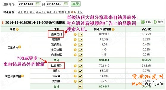 其中直接訪客的大部分流量都是來(lái)自鉆石展位的視頻網(wǎng)站的資源位,客戶在看視頻的時(shí)候就會(huì)看到視頻暫停,前貼片等廣告圖,記住了品牌詞,就會(huì)上淘寶網(wǎng)搜品牌詞,所以潛在新客戶和自然流量因?yàn)檎故緩V告的獨(dú)特魅力而不斷新增,前提是要持續(xù)投放~