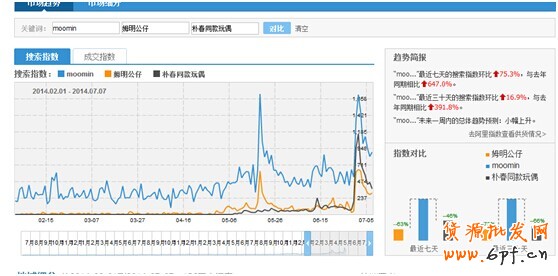 指數(shù)推薦的“Moomin” 搜索量是“樸春同款玩偶” 的兩倍多,并且是同一款寶貝,寶貝數(shù)量:寶貝數(shù)量是3600多,搜索量是1000左右。