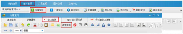 1、登陸淘寶助理—寶貝管理—創(chuàng)建寶貝—寶貝描述,選擇詳情模板: