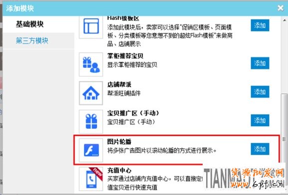 2、打開“添加模板”對(duì)話框,在列表中點(diǎn)擊“圖片輪播”右側(cè)的“添加”。