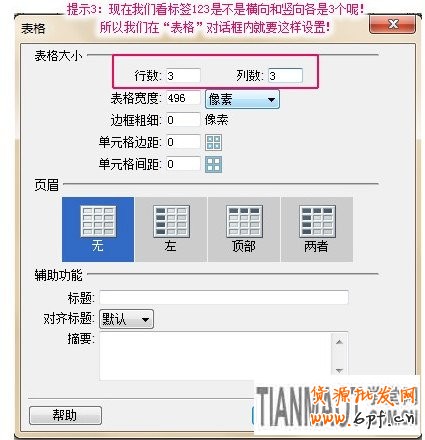 第二步,在下面彈出的框里設置表格的寬度為950像素。如果您要在左側做公告欄的話,那么這里的寬度就要設置190像素。