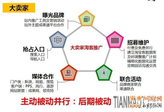 2)大賣家的操作方式更為全面,最主要的分為五個(gè):1、曝光皮牌; 2、起那個(gè)站入口;3、媒體合作; 4、聯(lián)合活動(dòng); 5、招募維護(hù)。