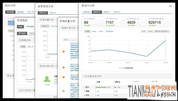 后臺除了擁有大家熟知的微博功能外,可以看到還專門增加了一個數(shù)據(jù)中心,包含了粉絲分析、商情監(jiān)控、微博頁面分析、店鋪流量分析和影響力分析。這些數(shù)據(jù)工具不僅能夠全面展現(xiàn)微博運(yùn)營的狀況,更可以展示導(dǎo)流數(shù)據(jù)。