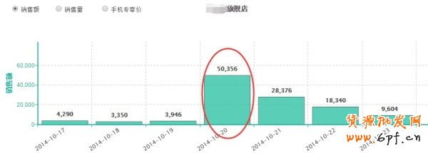知道上周我突然看到他店的銷售額大幅增長了12倍,從平均每天3000多,暴增到了5萬。大家可以從下面圖看到,這是用【淘寶知己知彼】來看的。憑常識,我肯定知道他做了活動了。