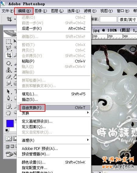 3、水印添加完后,你也可以直接在圖中拖住水印不放,來(lái)調(diào)整水印的位置,你也可以通過(guò)PS最上邊的“編輯”里的“自由變換”來(lái)改變水印的大小,如圖: