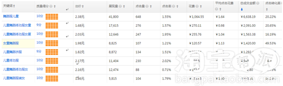 “兒童舞蹈服長(zhǎng)袖”這個(gè)詞的展現(xiàn)雖然低了,但是點(diǎn)擊率更高,市場(chǎng)均價(jià)要低一些,競(jìng)爭(zhēng)力小,我們可以更好的放大我們的優(yōu)勢(shì)。帶進(jìn)來(lái)的流量會(huì)更加精準(zhǔn)。