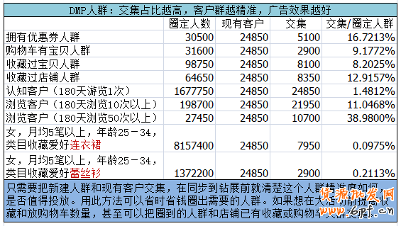 若你用DMP圈定了多個(gè)人群,想知道這些人群的精準(zhǔn)度如何,把這些人群與現(xiàn)有客戶交集,然后計(jì)算前面提到的比例(已圈定的人群可以在修改那繼續(xù)增加新標(biāo)簽現(xiàn)有客戶)。把所有人群比例統(tǒng)計(jì)出來(lái),你將一目了然看出這些人群哪個(gè)精準(zhǔn)度最高,哪些可以重點(diǎn)投放,哪些需要大流量時(shí)才需要投放?,F(xiàn)有客戶越多的店鋪,得到的精準(zhǔn)度越準(zhǔn)確,越具有參考價(jià)值!